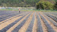 두둑간격을 35cm로 해서 일정한 간격으로 구멍을 뚫은후  모종을 넣은다음 , 비닐안의 흙을 모종주위로 손으로 살살 끓어서 해준다음 꾹 눌러주시면 됩니다. 흙을 덮는다고 하면 시간도 많이 걸리 뿐더러 옥수수는 별도로 흙을 안덮어줘도 된다고 합니다.